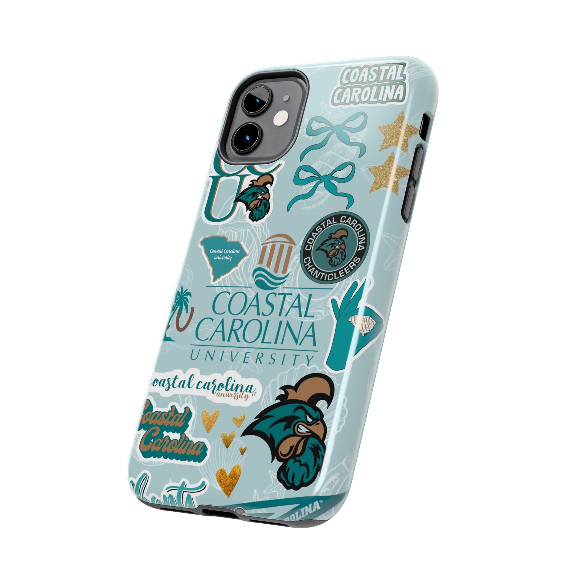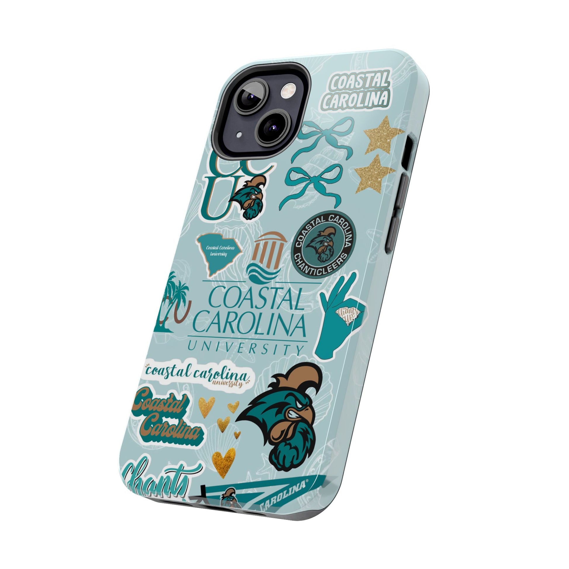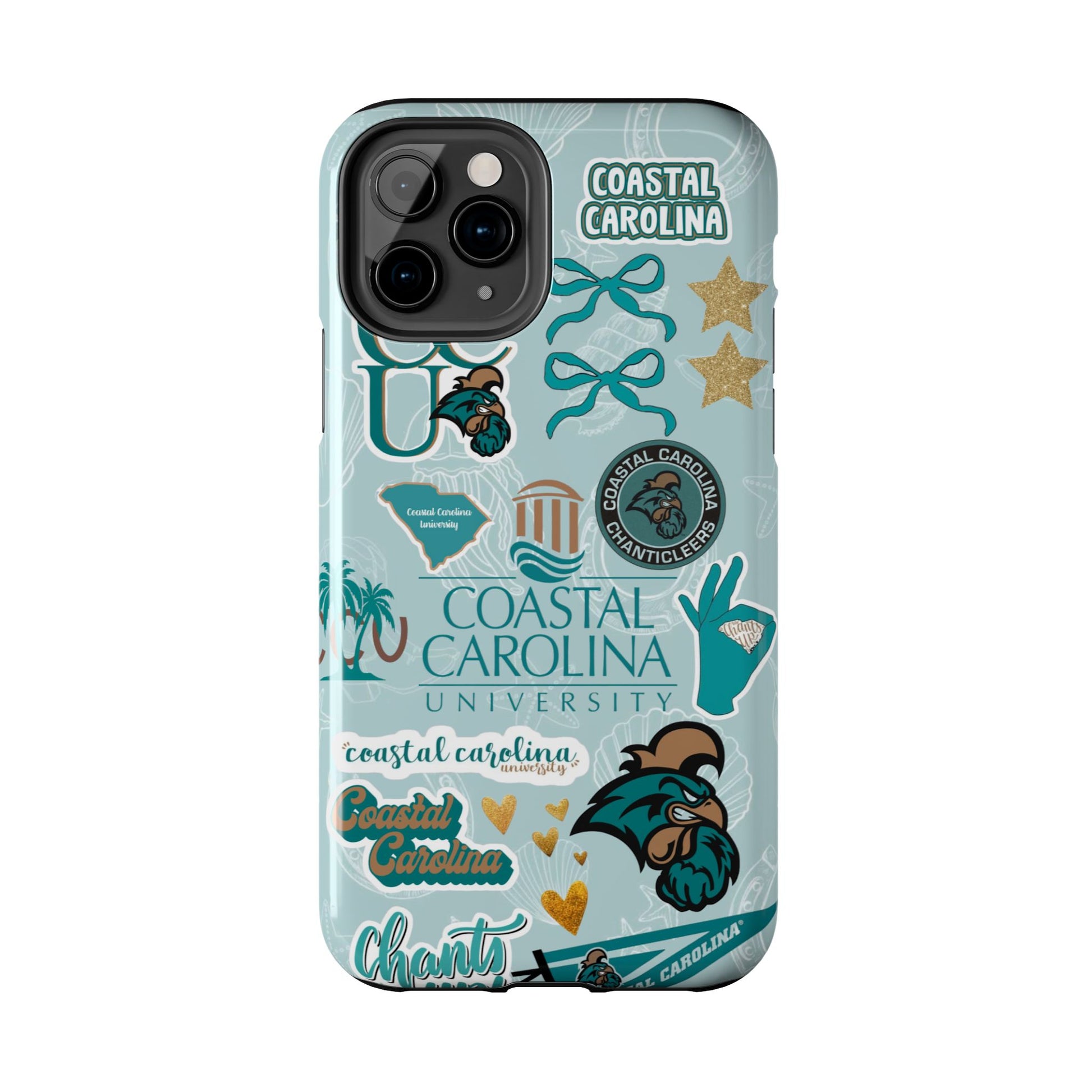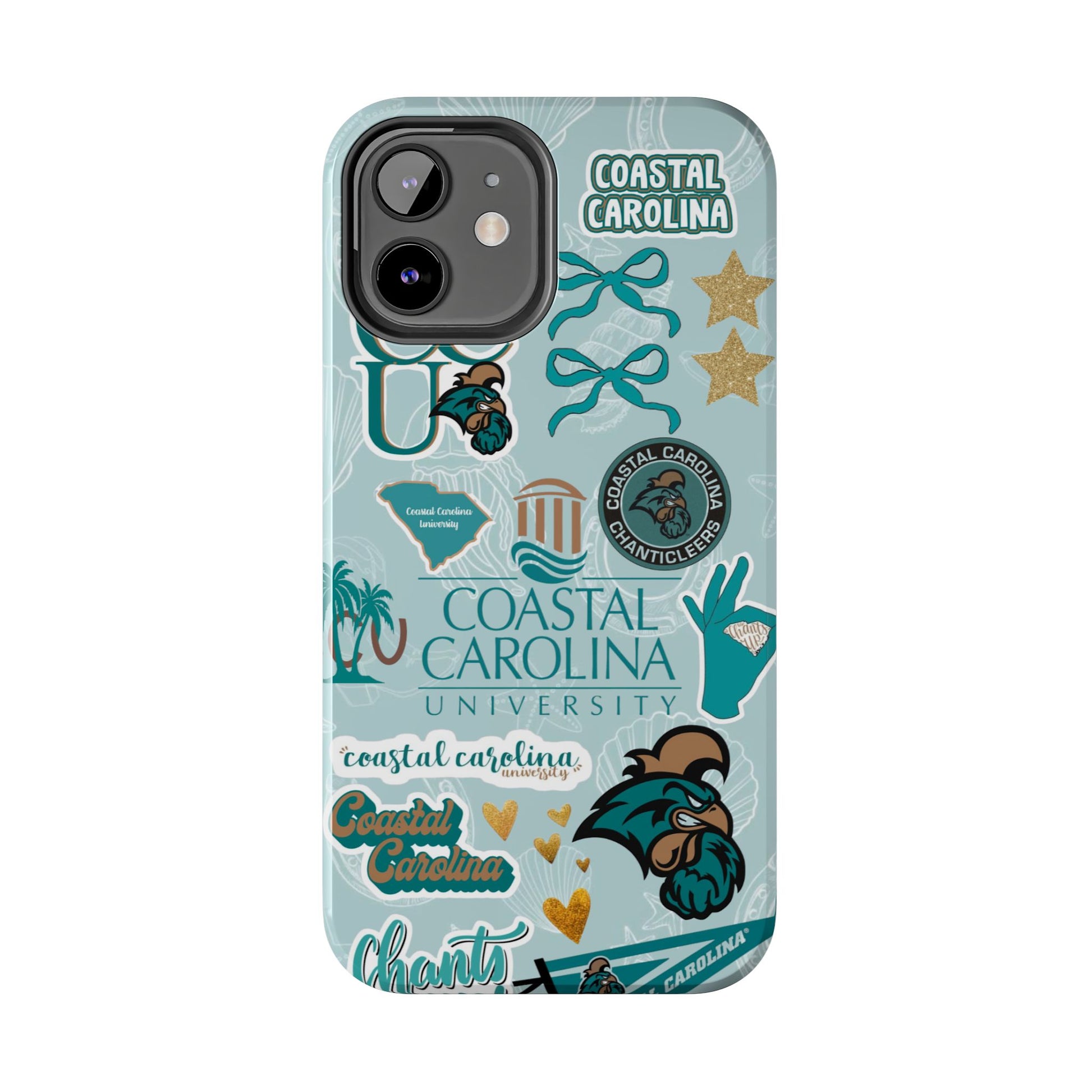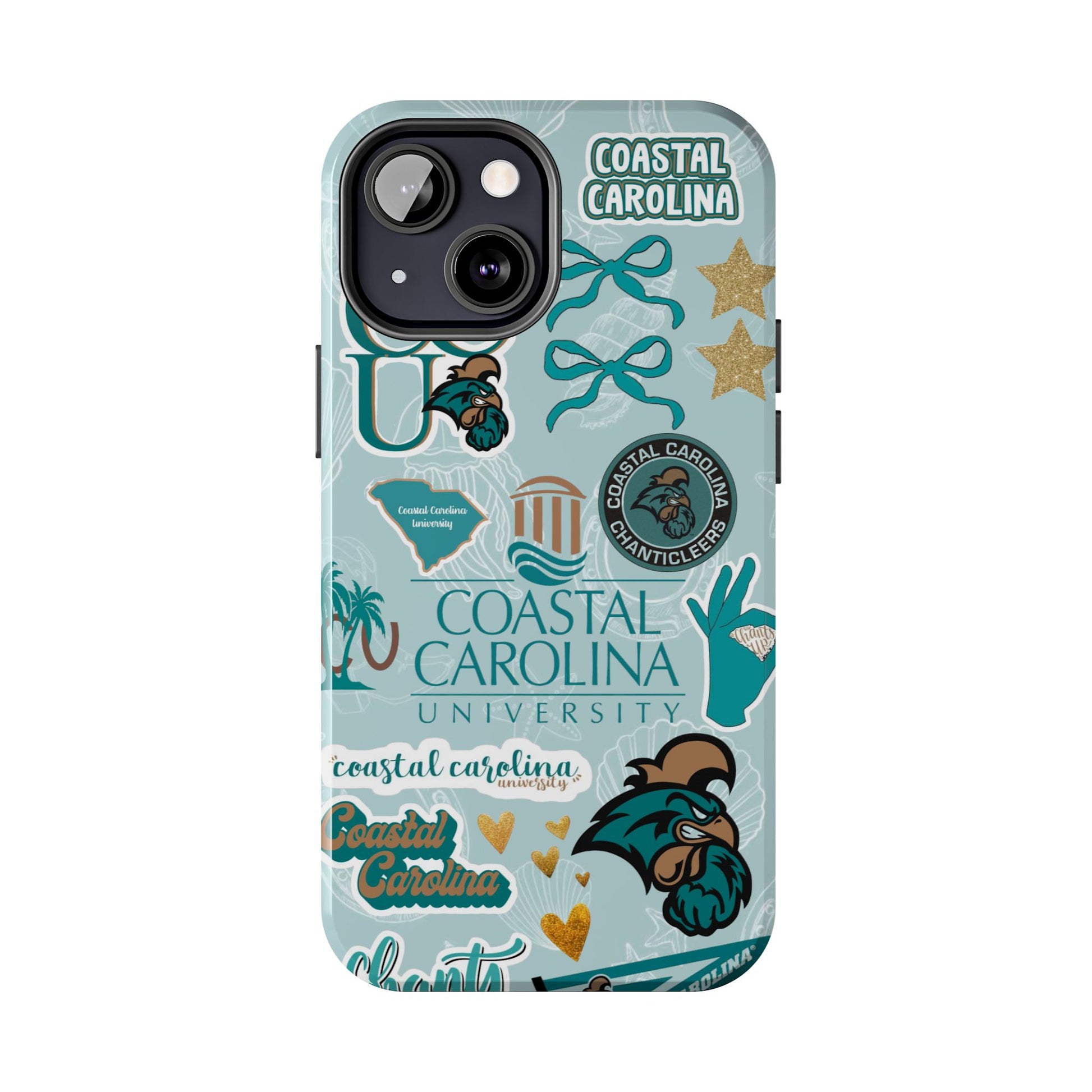 Show off your Coastal Carolina pride with this bold and beachy phone case! Featuring a collage of teal bows, golden stars, Chanticleer mascots, and iconic Coastal Carolina University logos, this case brings all the coastal vibes and school spirit in one stylish design. Perfect for students, alumni, or fans who bleed teal and love to stand out!
