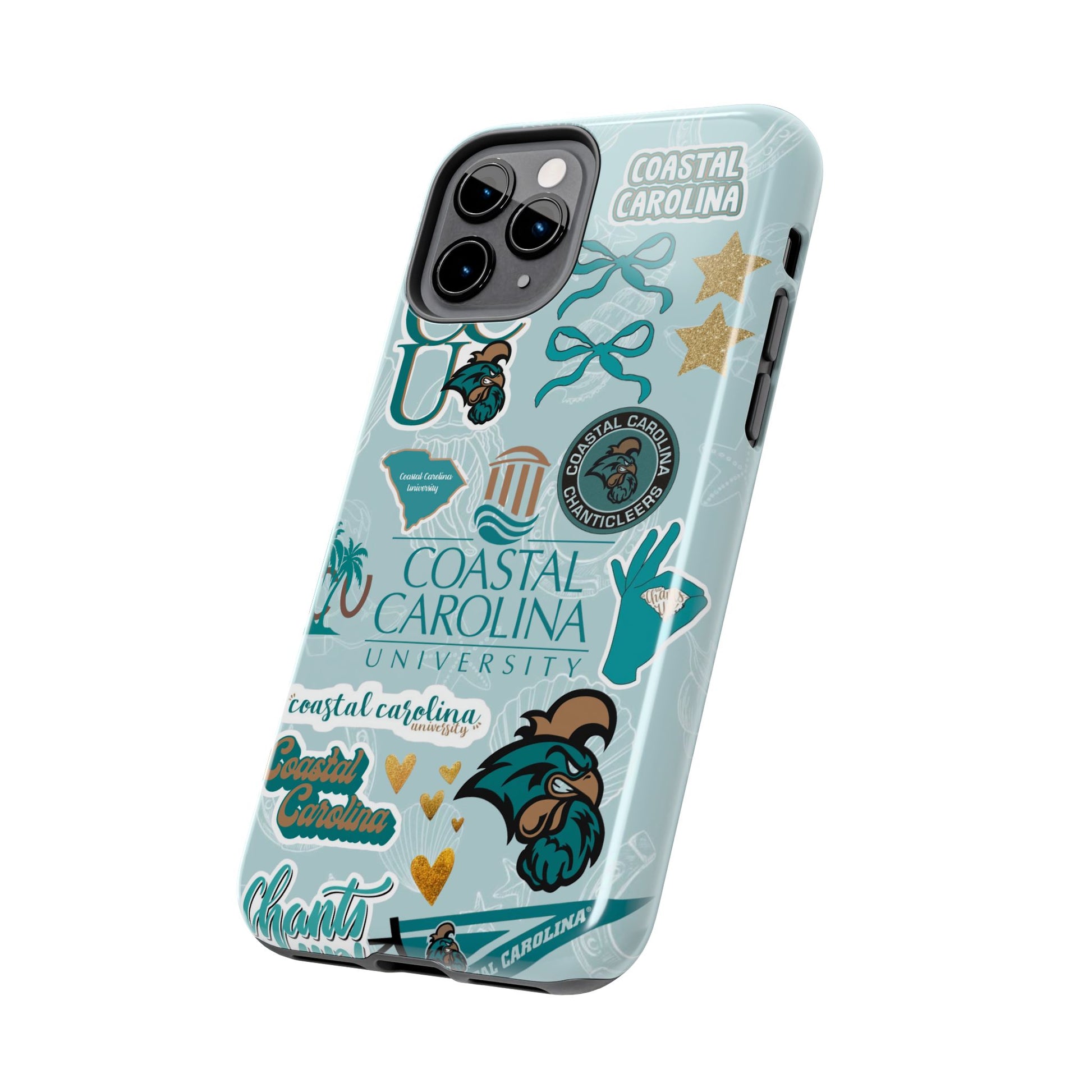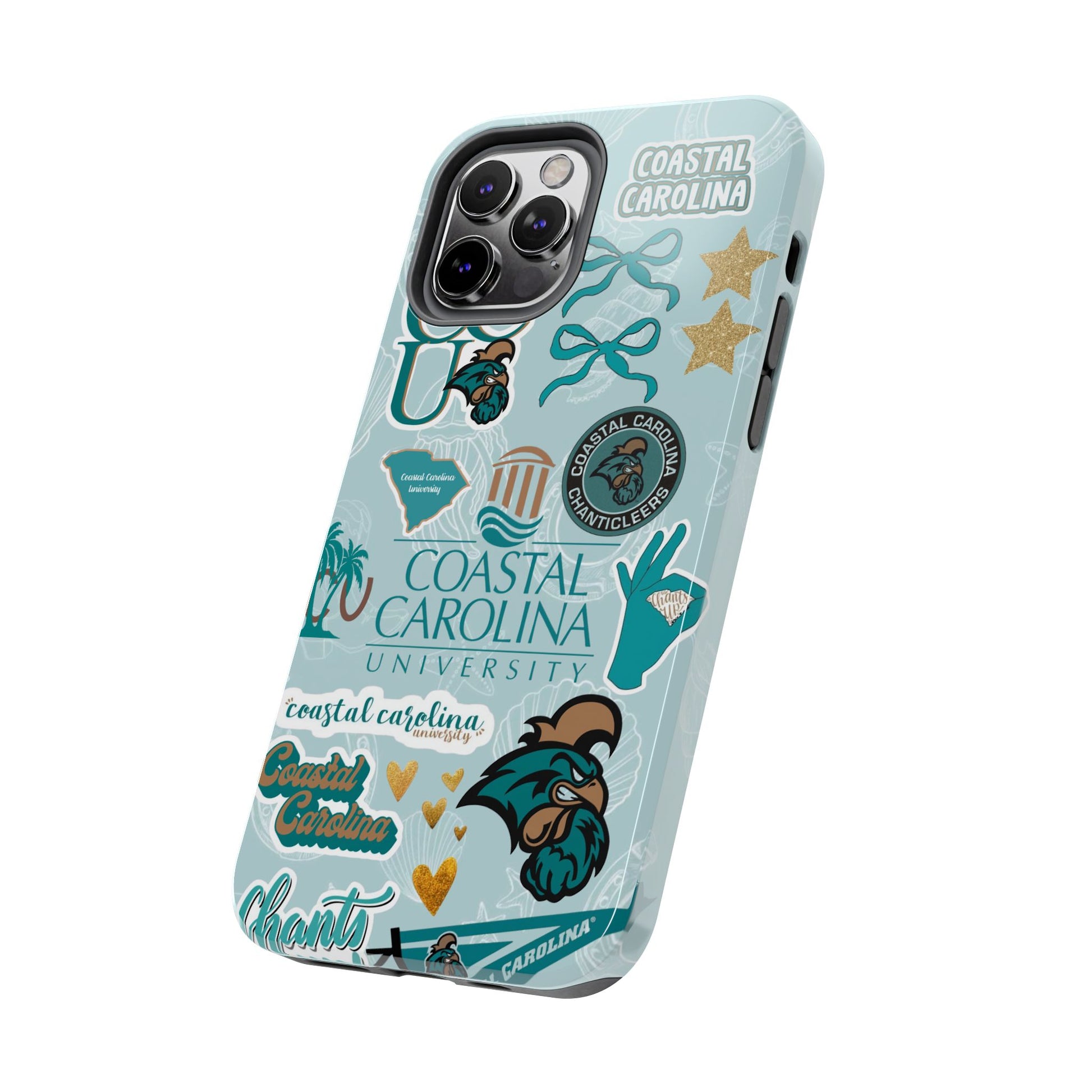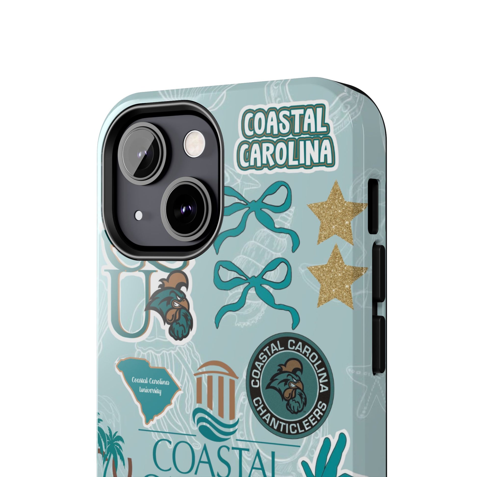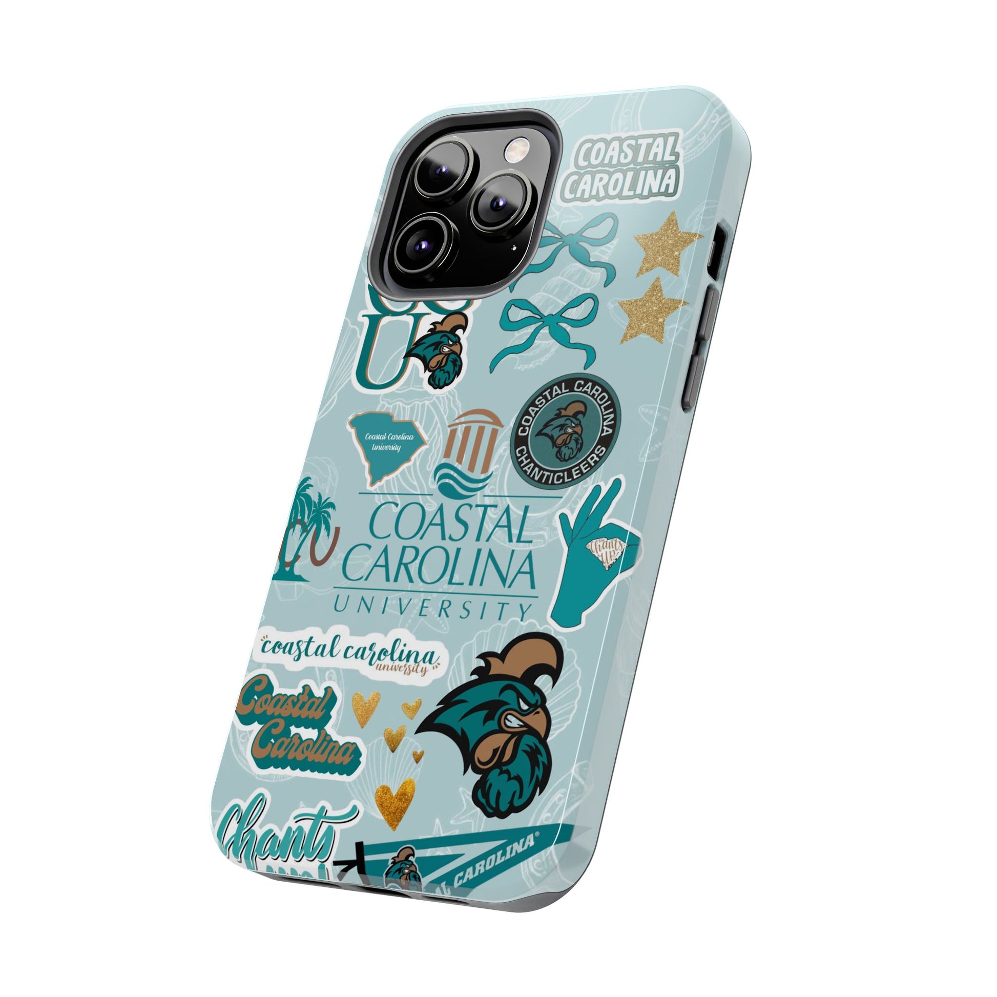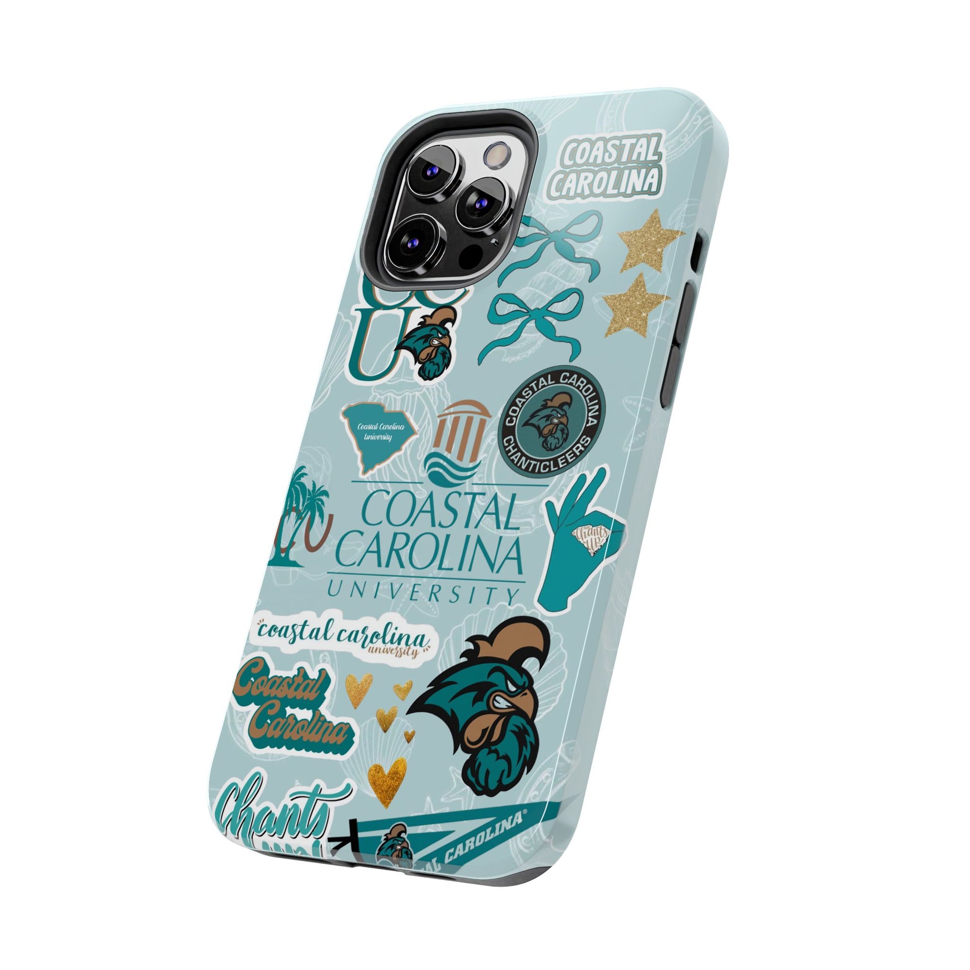 Show off your Coastal Carolina pride with this bold and beachy phone case! Featuring a collage of teal bows, golden stars, Chanticleer mascots, and iconic Coastal Carolina University logos, this case brings all the coastal vibes and school spirit in one stylish design. Perfect for students, alumni, or fans who bleed teal and love to stand out!