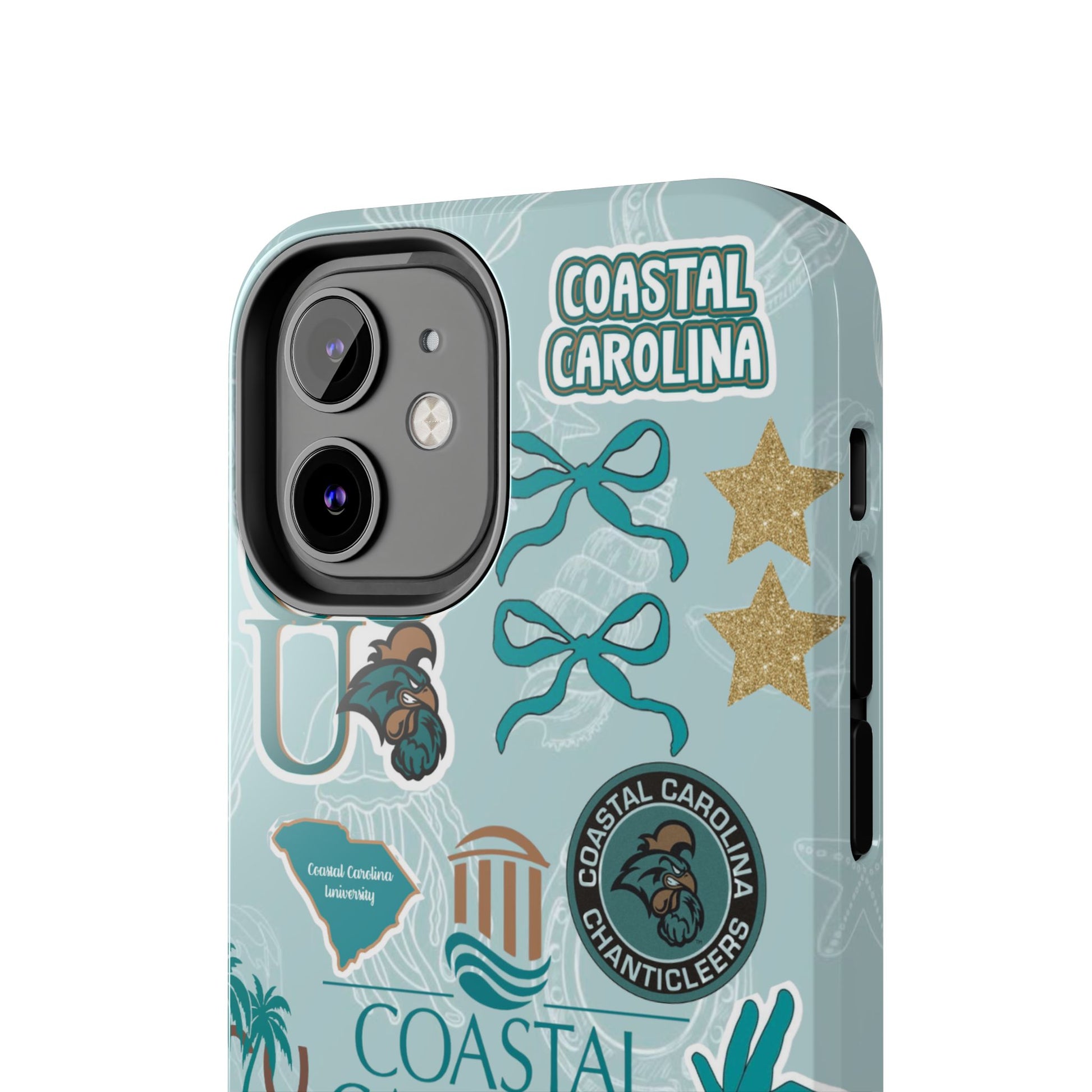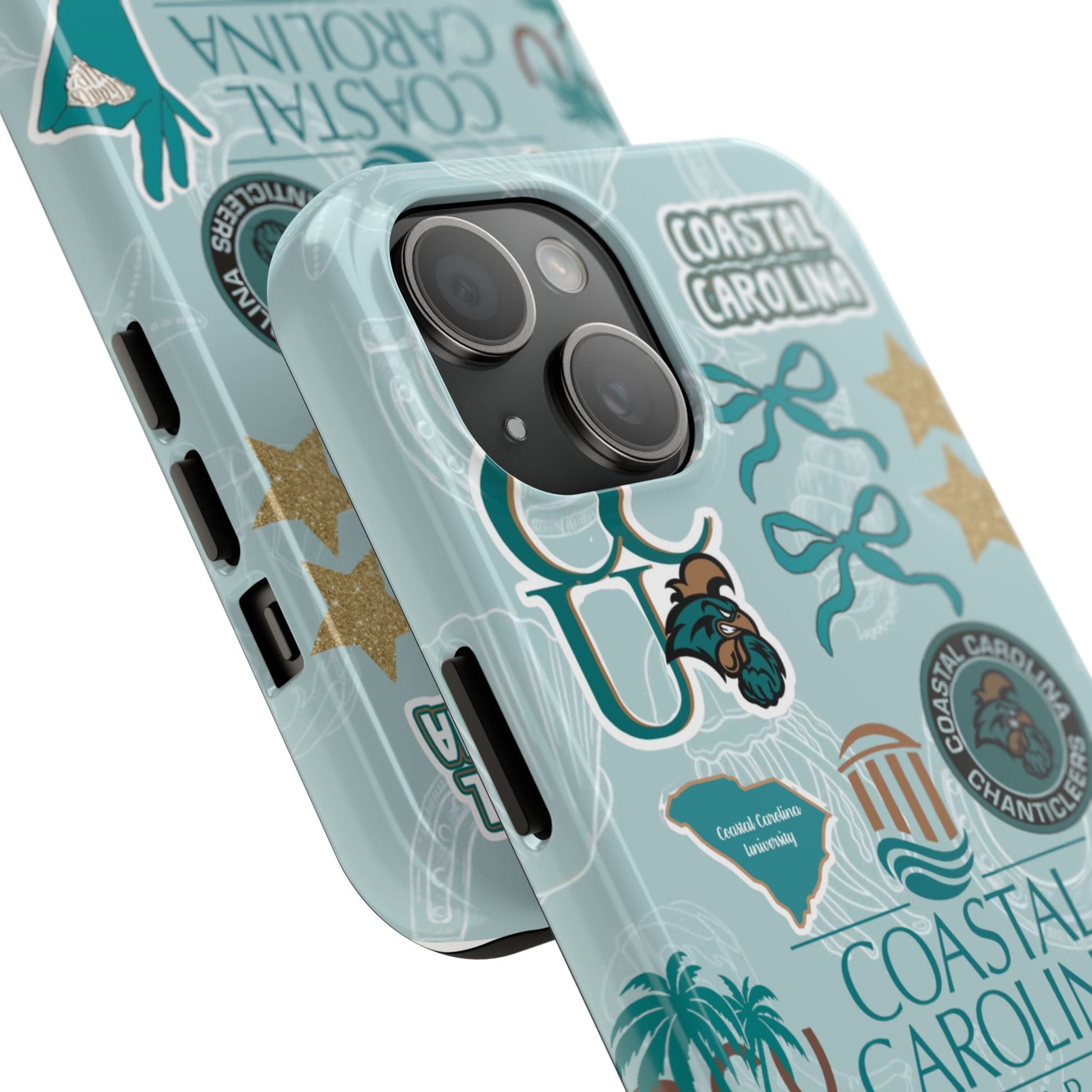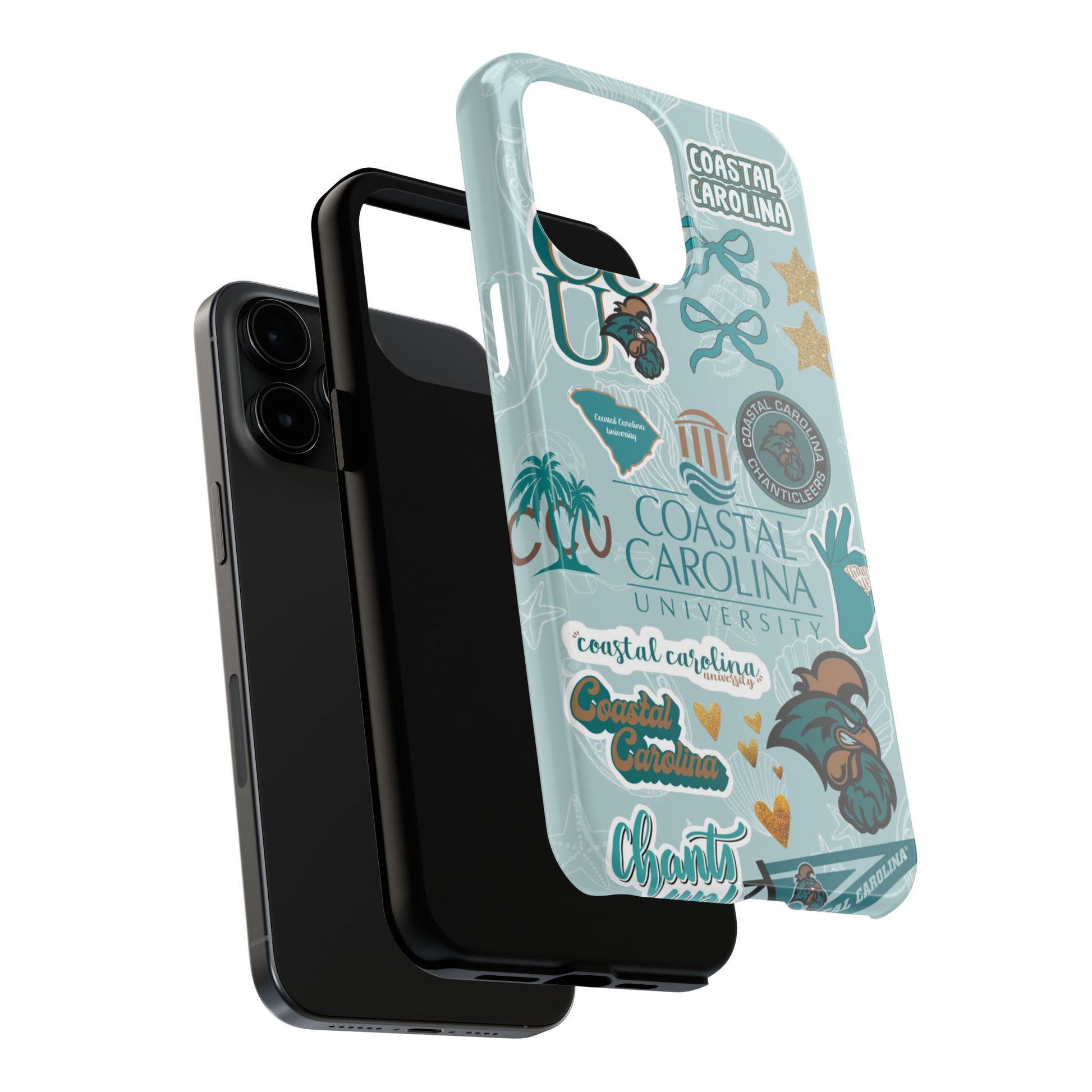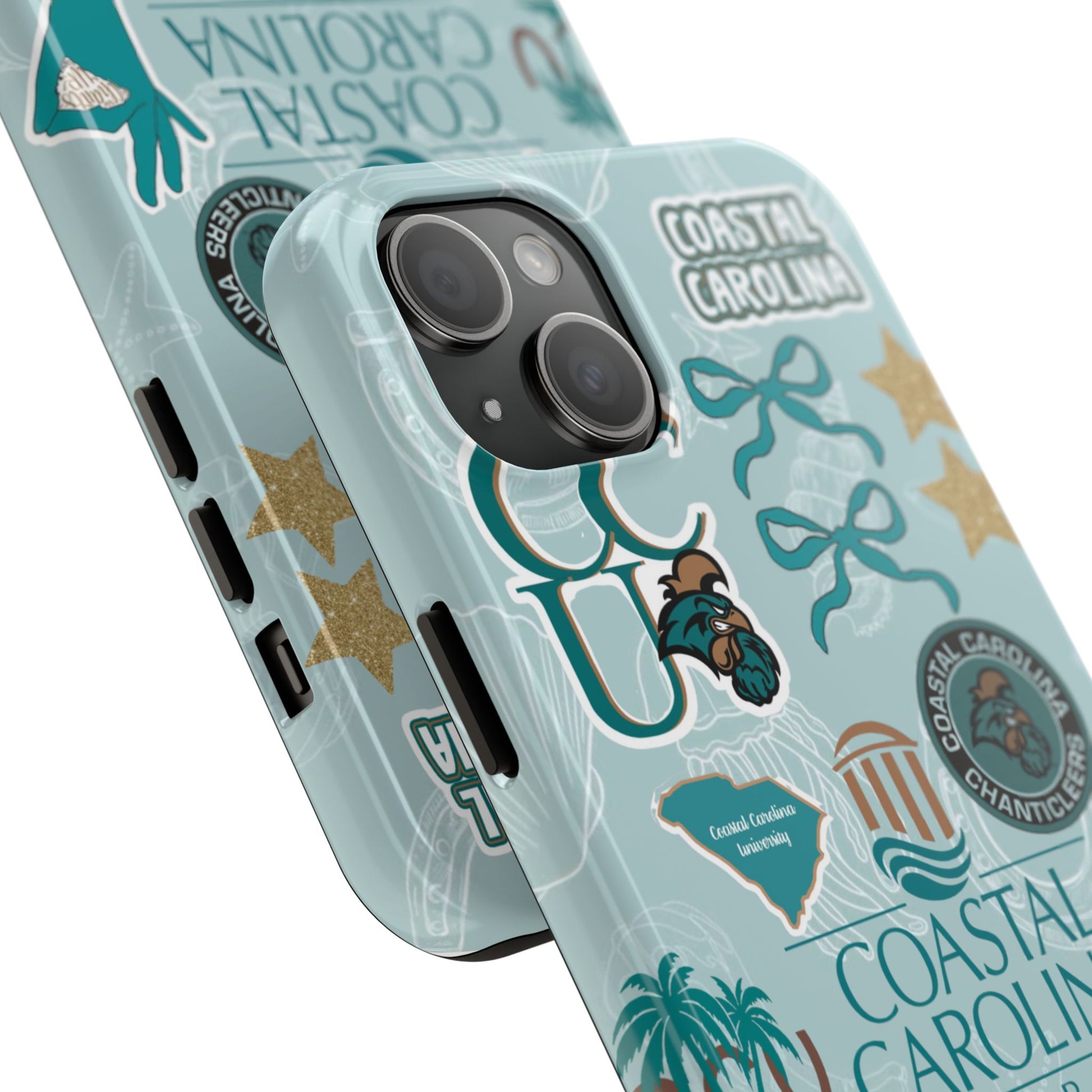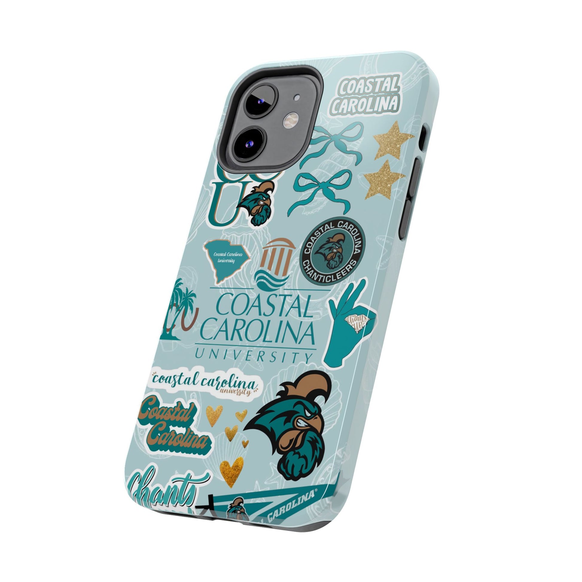Show off your Coastal Carolina pride with this bold and beachy phone case! Featuring a collage of teal bows, golden stars, Chanticleer mascots, and iconic Coastal Carolina University logos, this case brings all the coastal vibes and school spirit in one stylish design. Perfect for students, alumni, or fans who bleed teal and love to stand out!