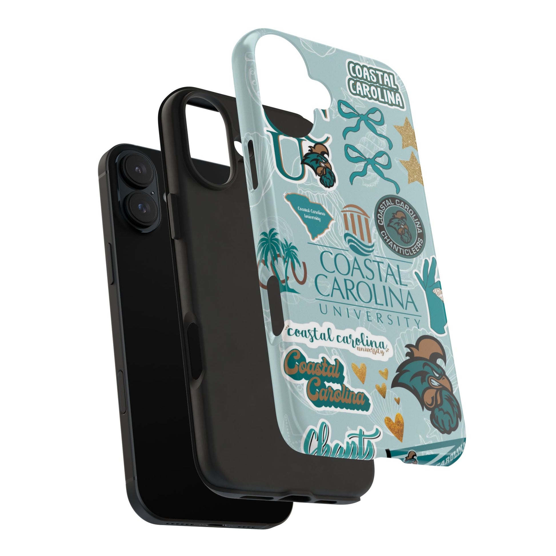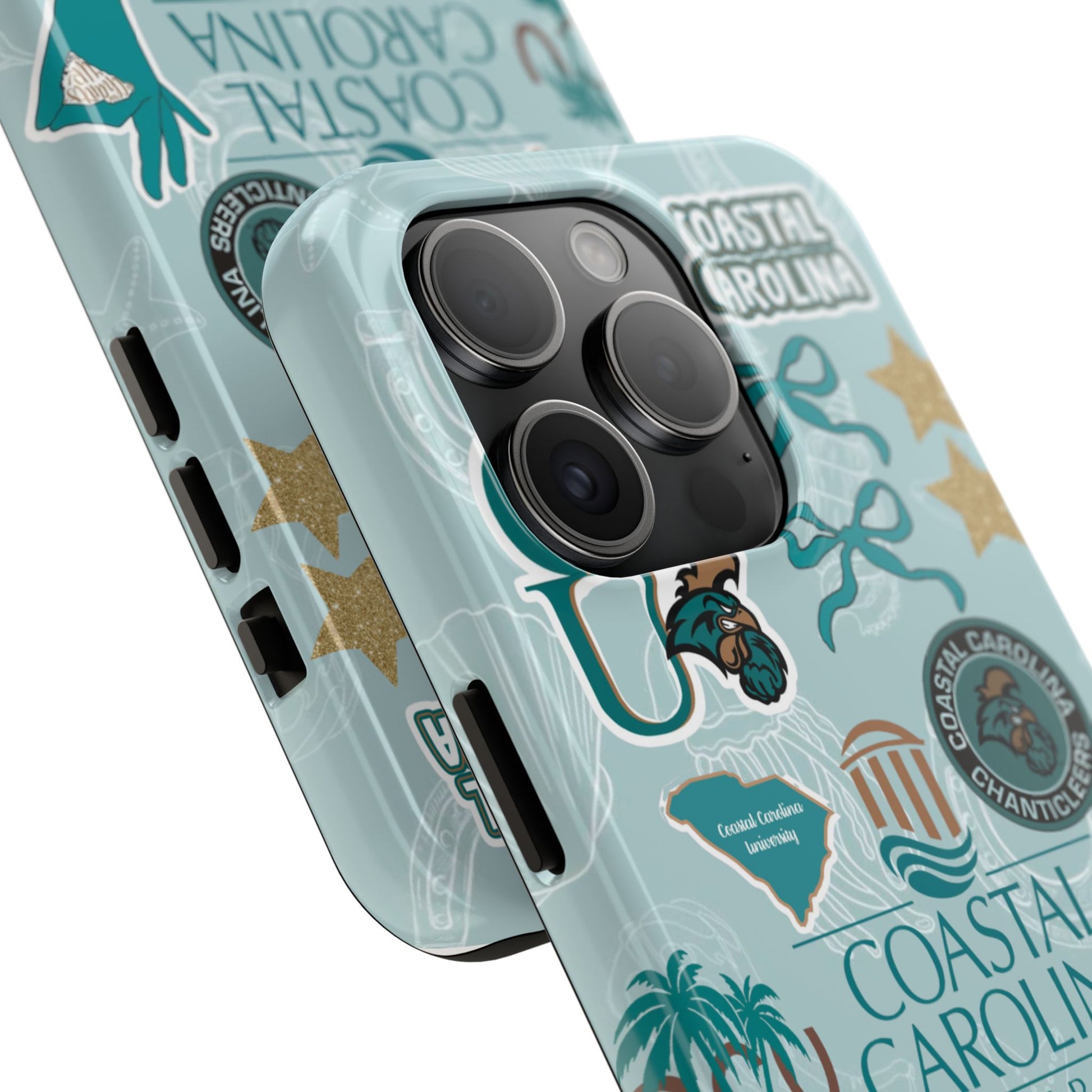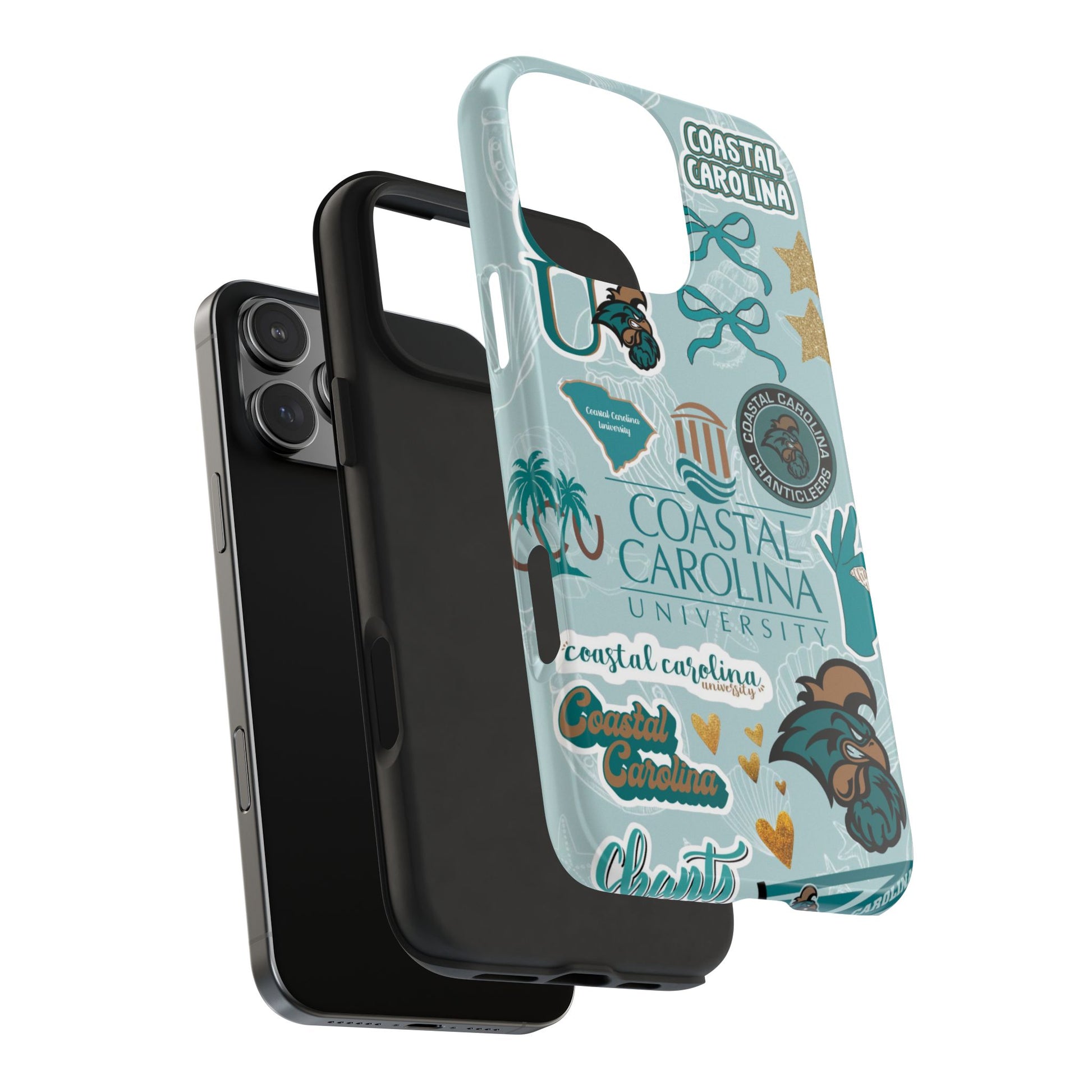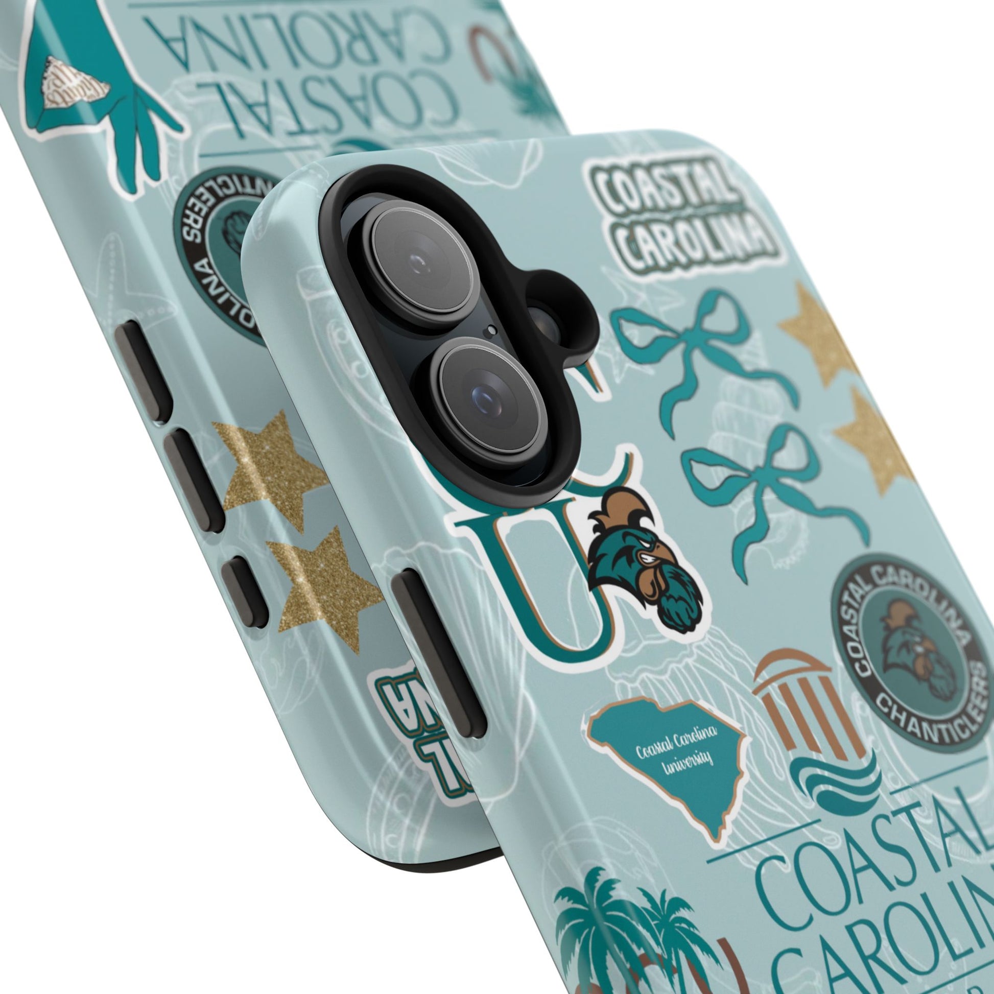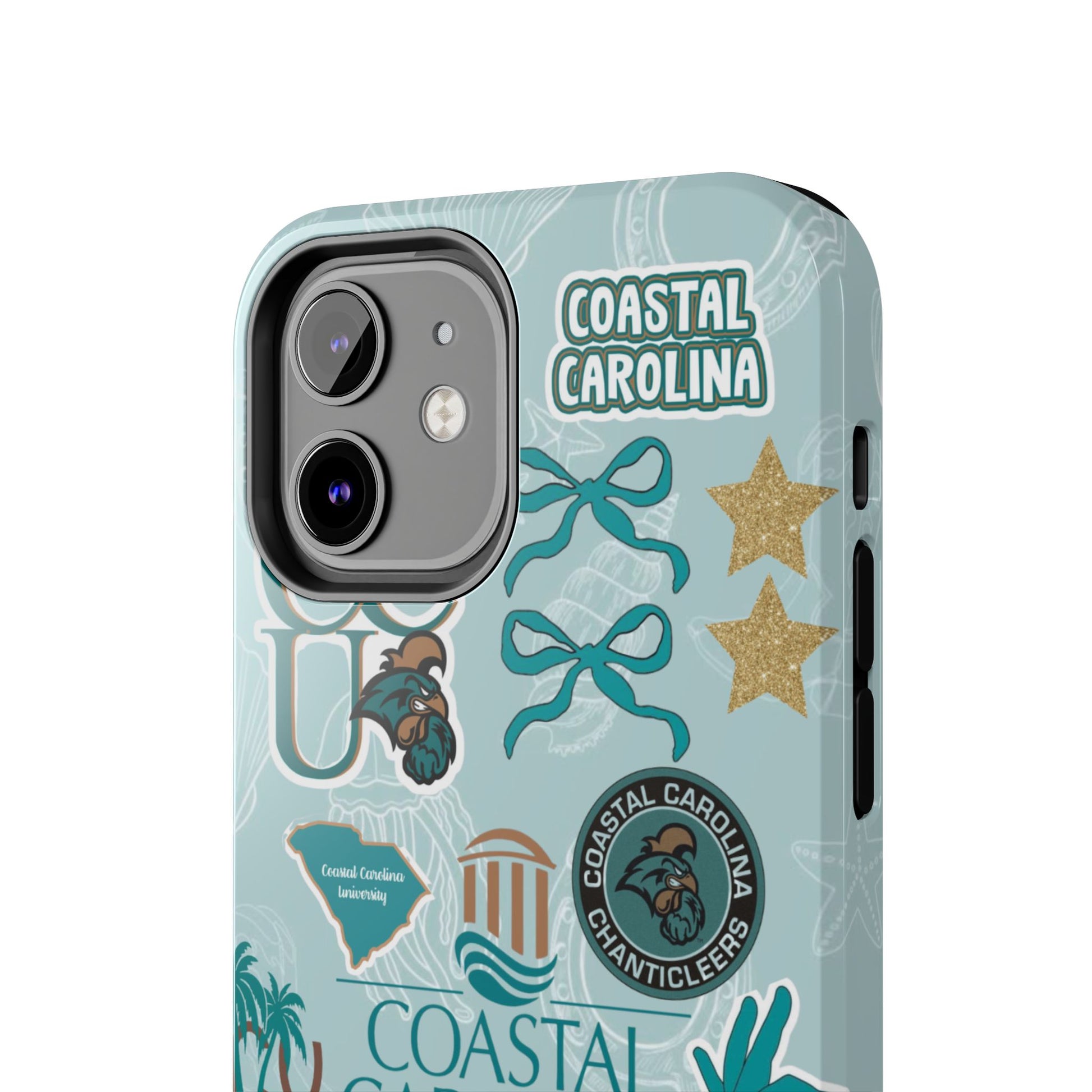 Show off your Coastal Carolina pride with this bold and beachy phone case! Featuring a collage of teal bows, golden stars, Chanticleer mascots, and iconic Coastal Carolina University logos, this case brings all the coastal vibes and school spirit in one stylish design. Perfect for students, alumni, or fans who bleed teal and love to stand out!
