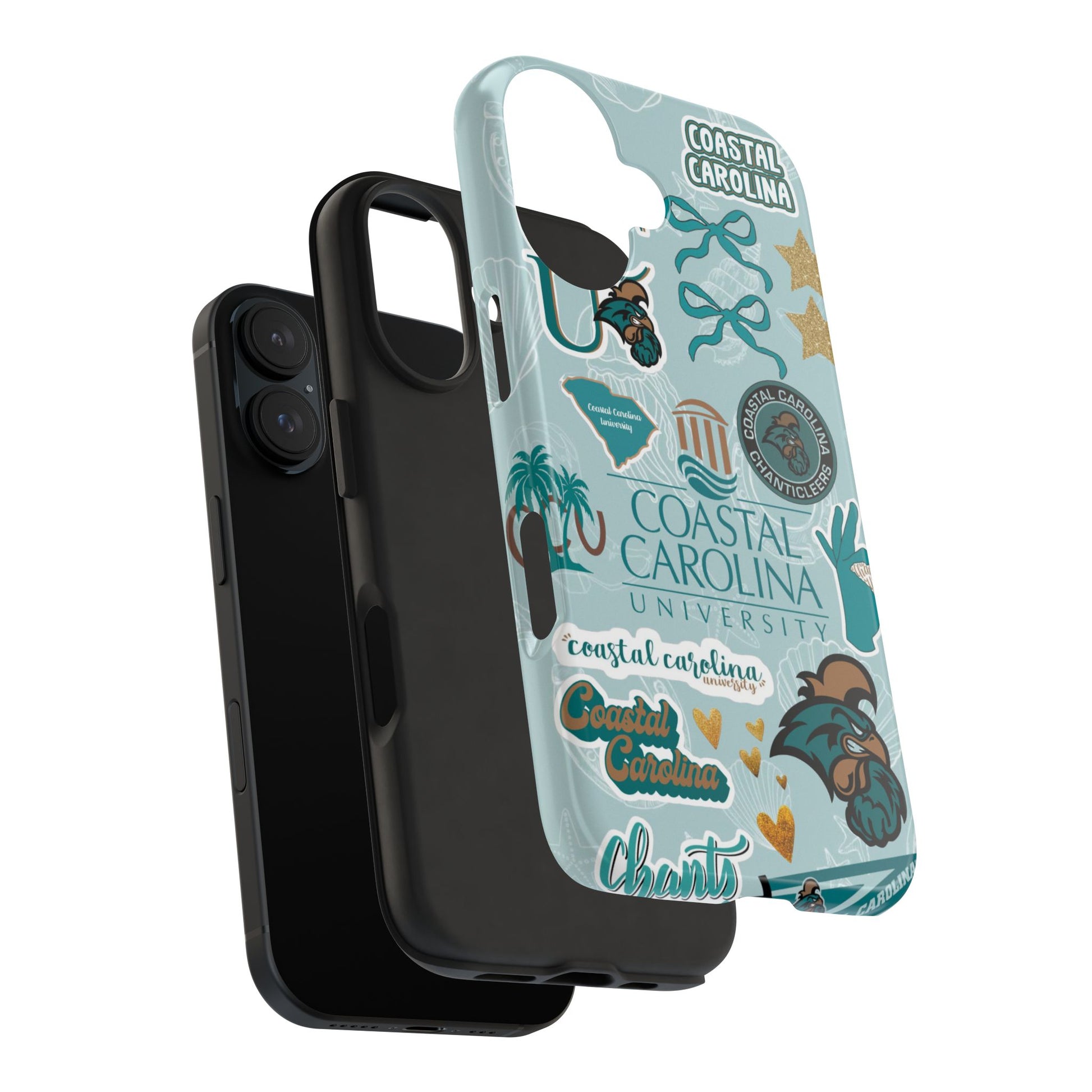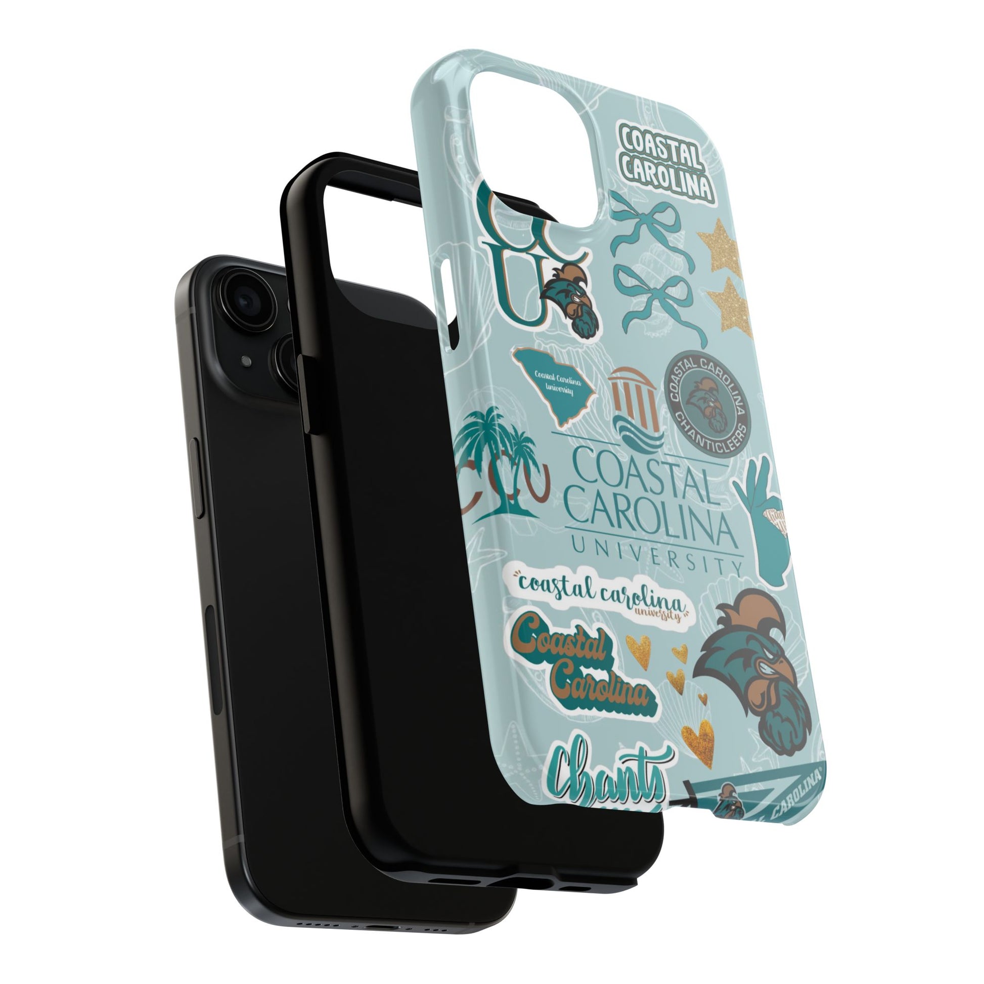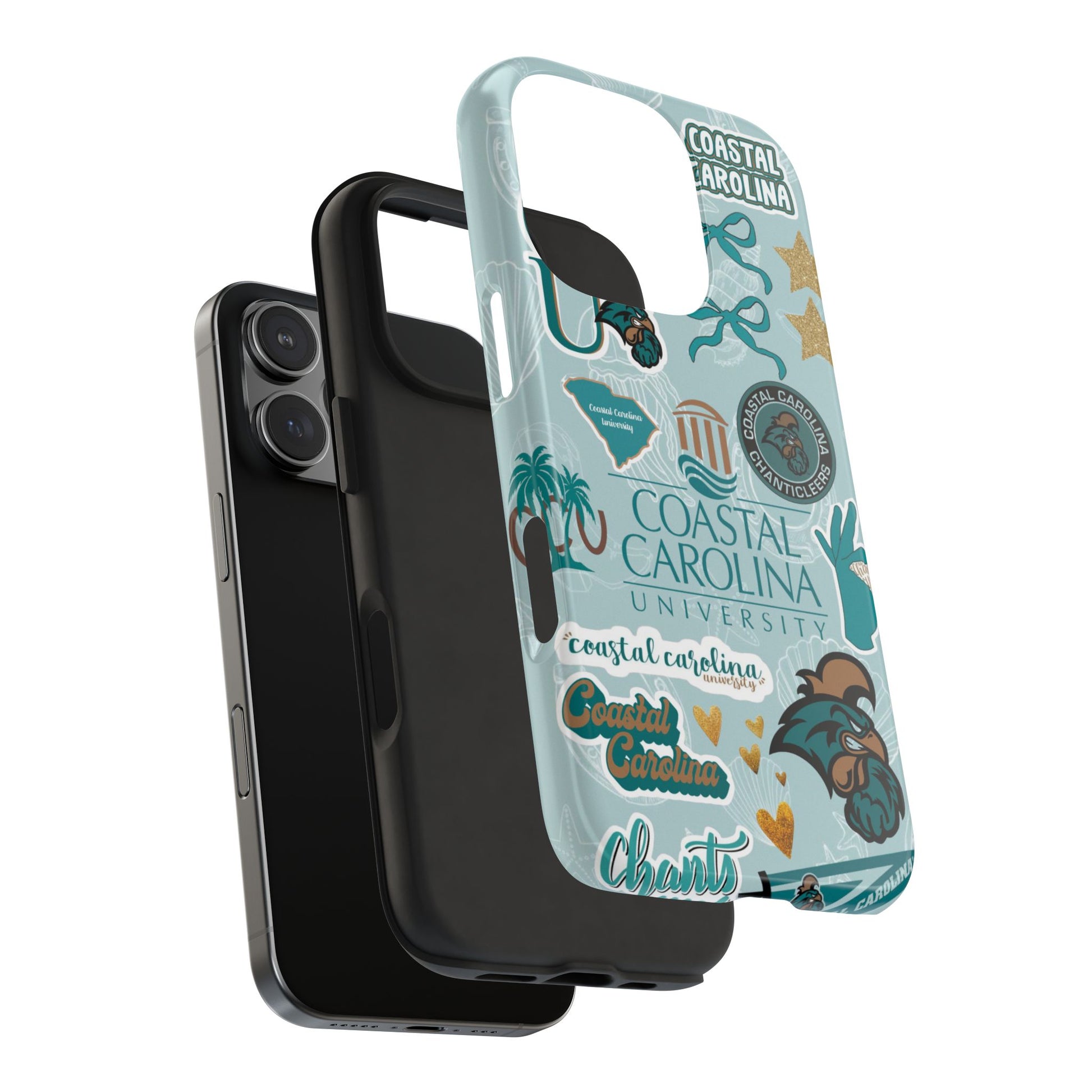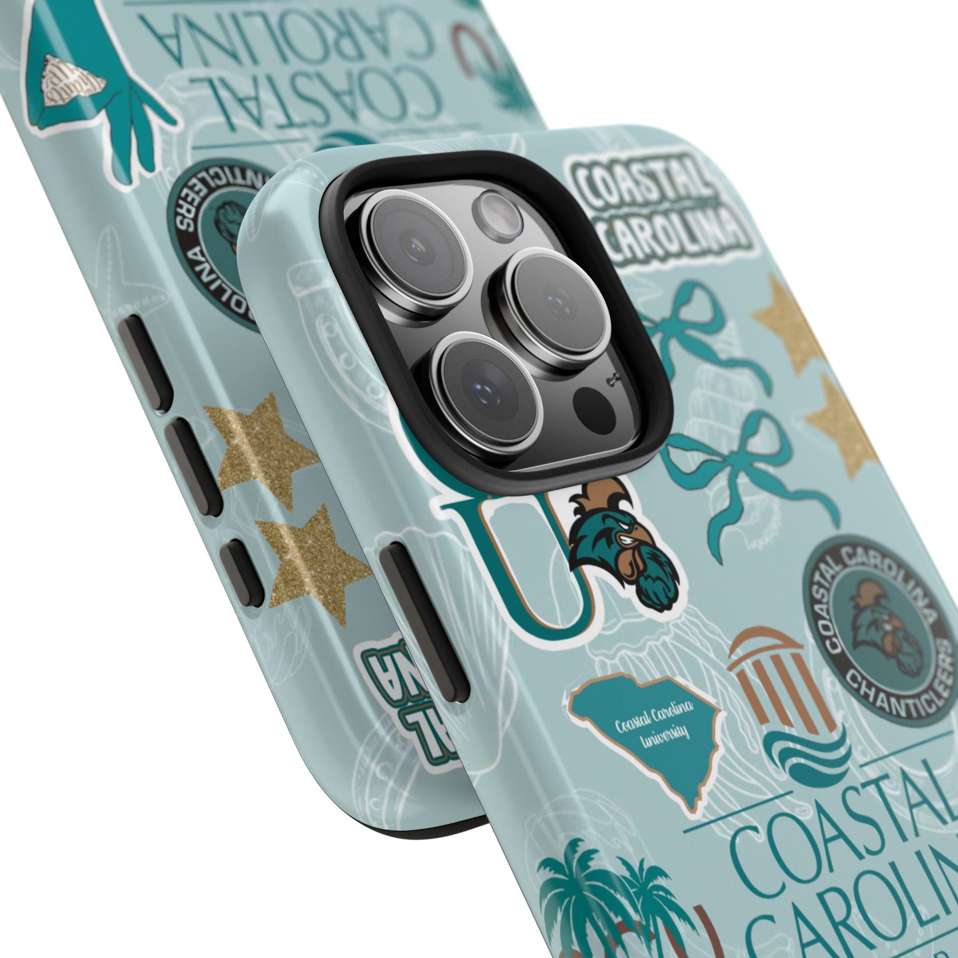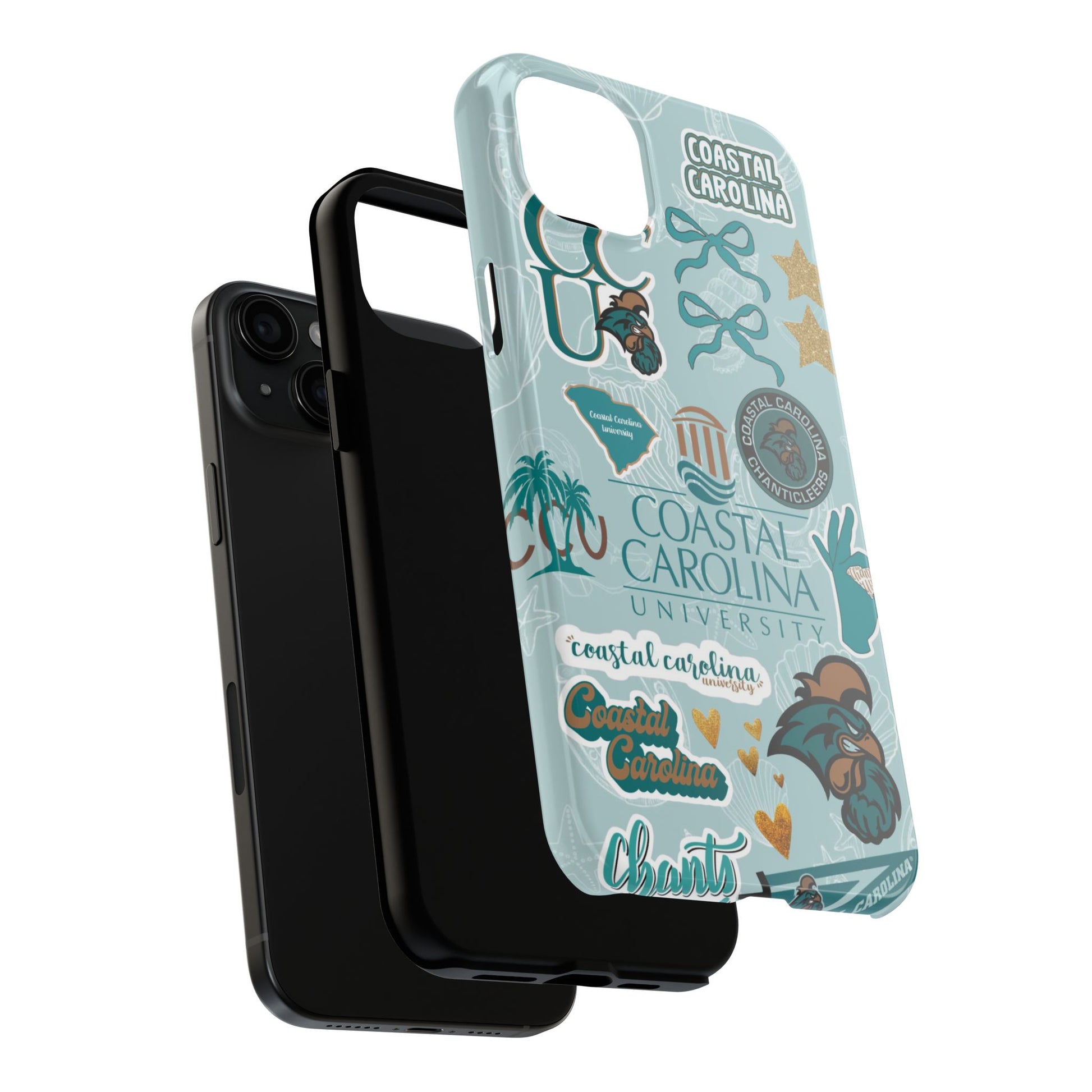 Show off your Coastal Carolina pride with this bold and beachy phone case! Featuring a collage of teal bows, golden stars, Chanticleer mascots, and iconic Coastal Carolina University logos, this case brings all the coastal vibes and school spirit in one stylish design. Perfect for students, alumni, or fans who bleed teal and love to stand out!