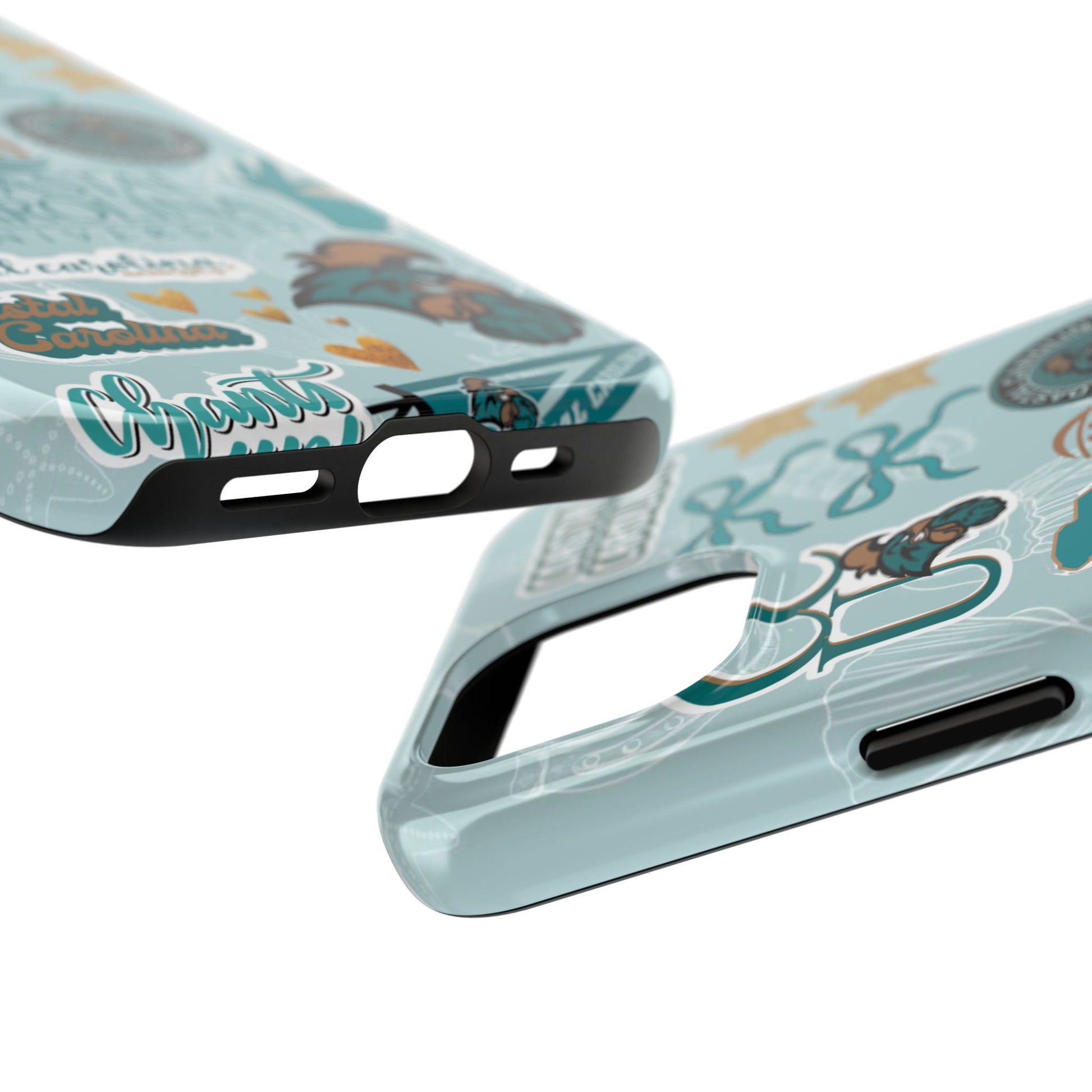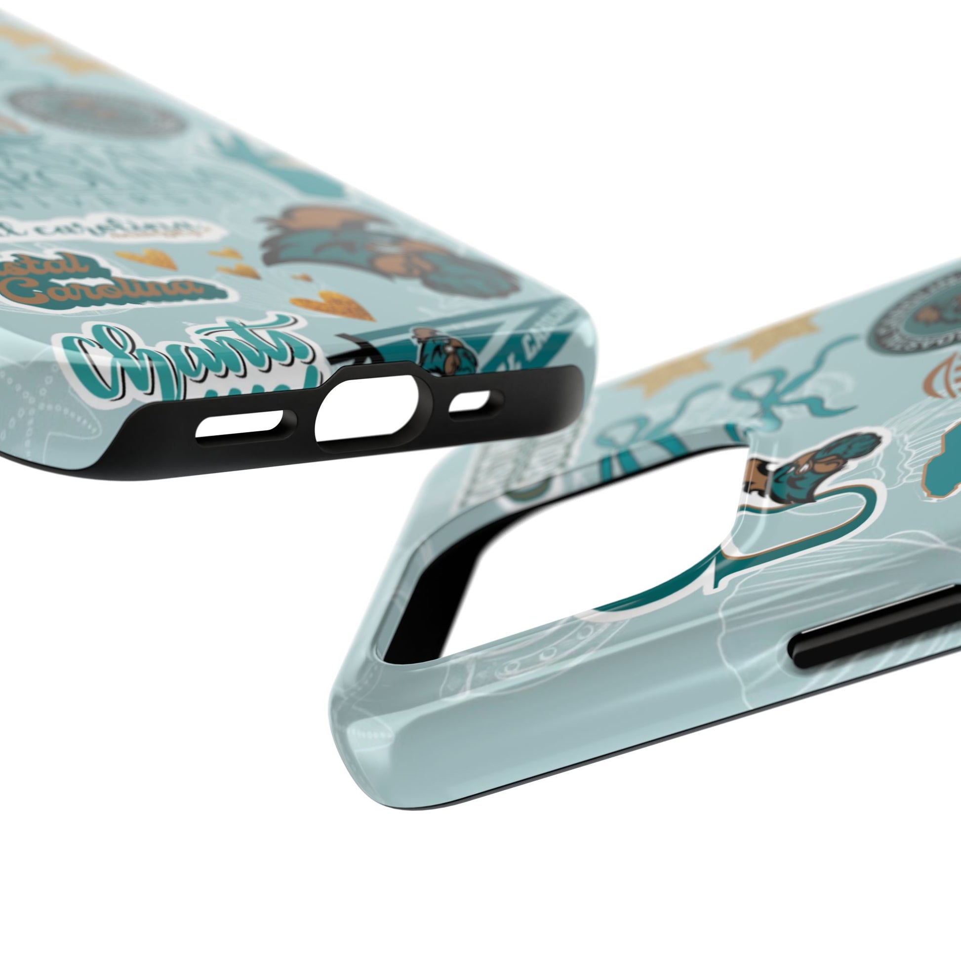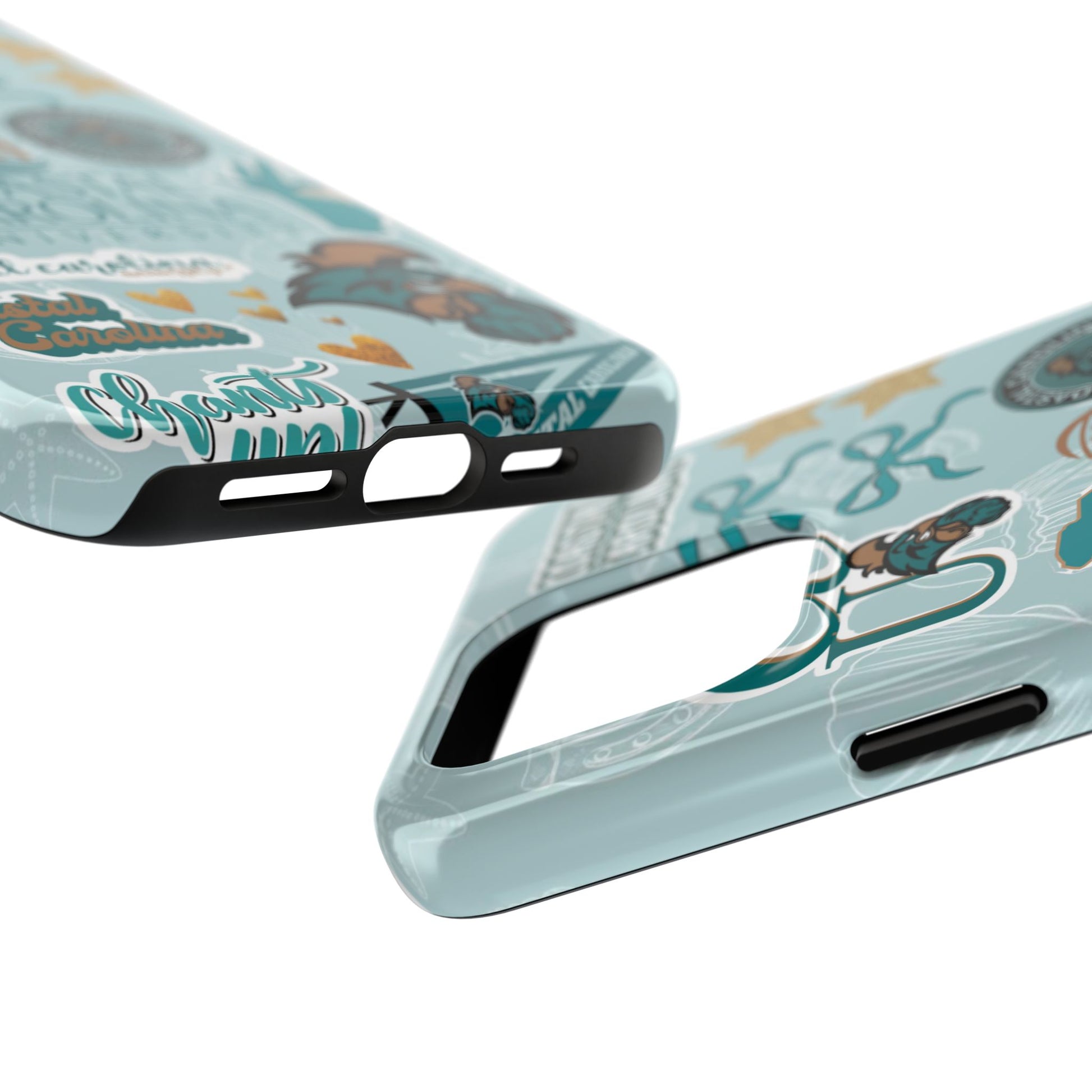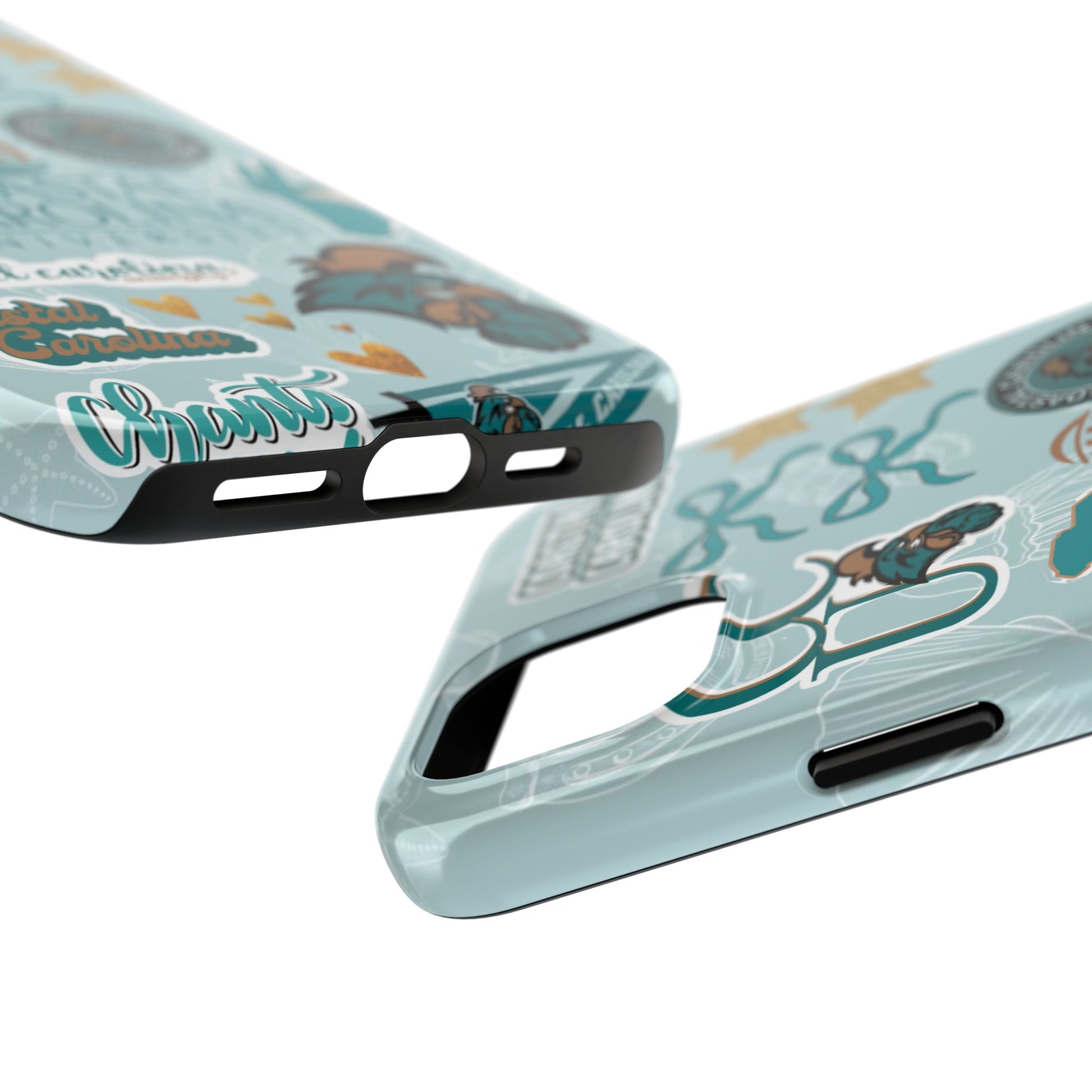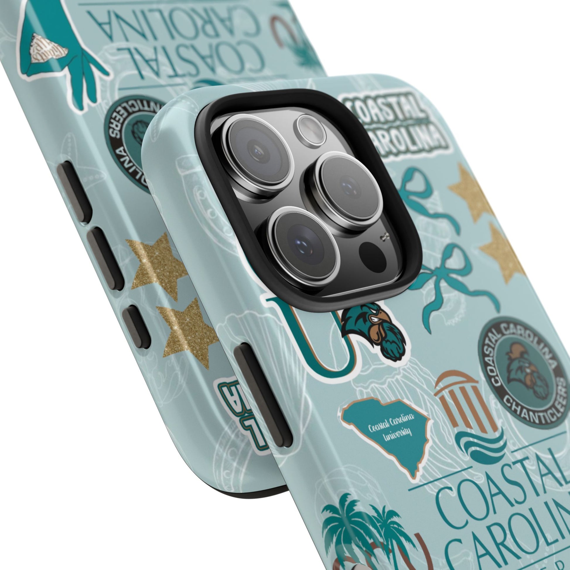 Show off your Coastal Carolina pride with this bold and beachy phone case! Featuring a collage of teal bows, golden stars, Chanticleer mascots, and iconic Coastal Carolina University logos, this case brings all the coastal vibes and school spirit in one stylish design. Perfect for students, alumni, or fans who bleed teal and love to stand out!